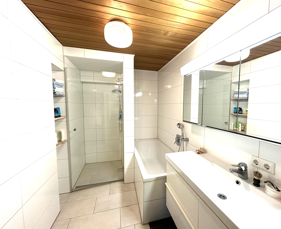 Das helle Wohnzimmer mit seinem großzügigen Essbereich bildet das Herzstück der Wohnung. Ein Kamin sorgt hier für eine behagliche Atmosphäre an kühleren Tagen. Die gemütliche, tageslichthelle Küche lädt zum Kochen und Verweilen ein. Das Badezimmer mit Badewanne + Dusche bietet zusätzlichen Komfort, während ein separates WC die Raumaufteilung ideal ergänzt.